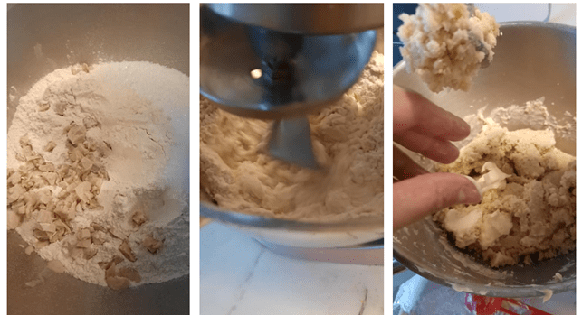 Pétrir à nouveau pendant 15 minutes environ jusqu’à que la pâte se décolle parfaitement, puis pétrir environ 15 mn à la main pour former une pâte homogène, élastique et pas trop ferme.