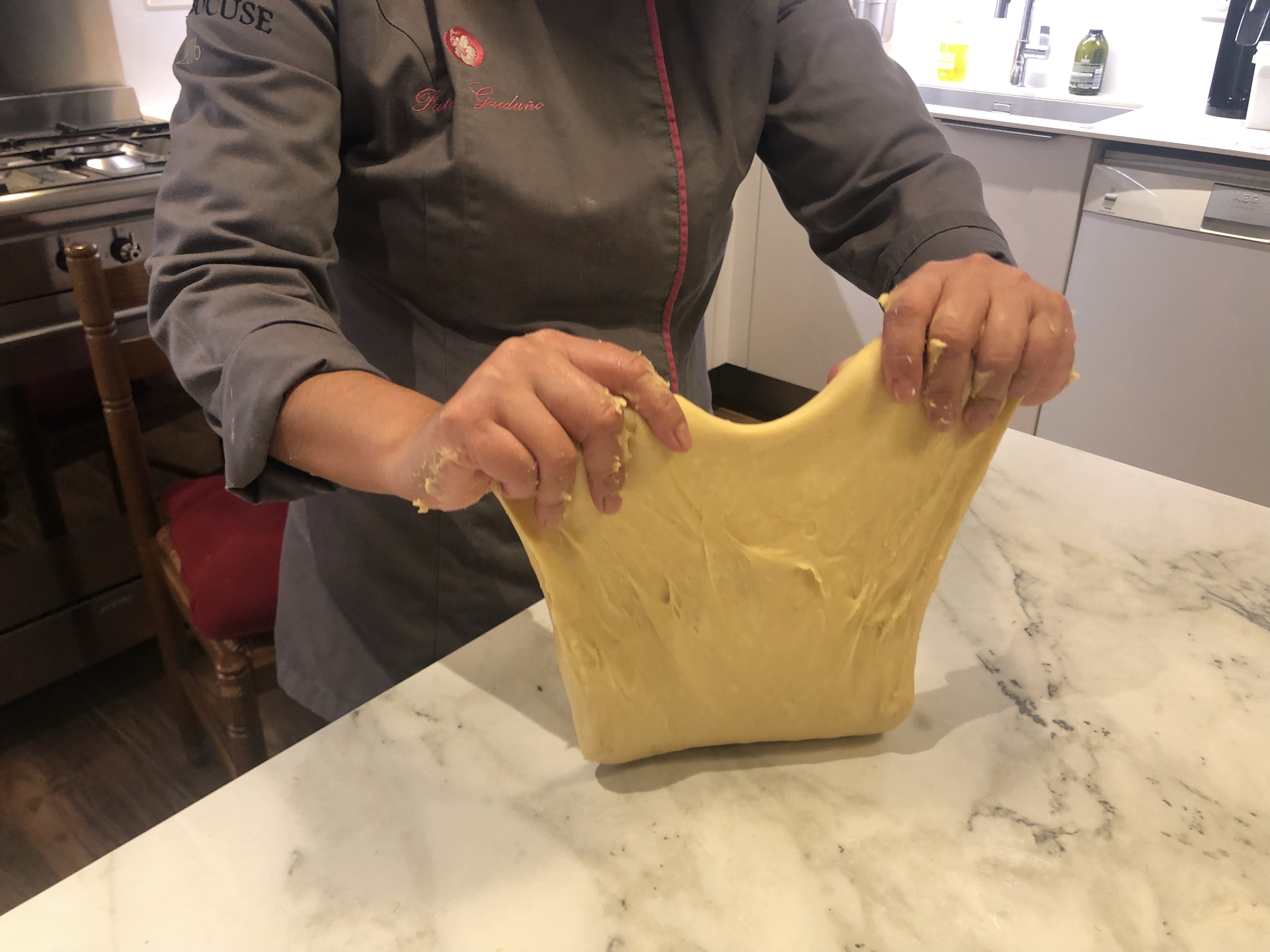 Pétrir au crochet (ustensile fourni avec le batteur et utilisé pour préparer la pâte à pain) pendant 5 minutes, puis ajouter en deux fois le beurre coupé en petits morceaux. Quand la pâte se décolle bien, incorporer le reste des œufs. Rajouter un peu de farine uniquement si la pâte reste encore liquide et jusqu’à que la pâte se décolle du bowl.