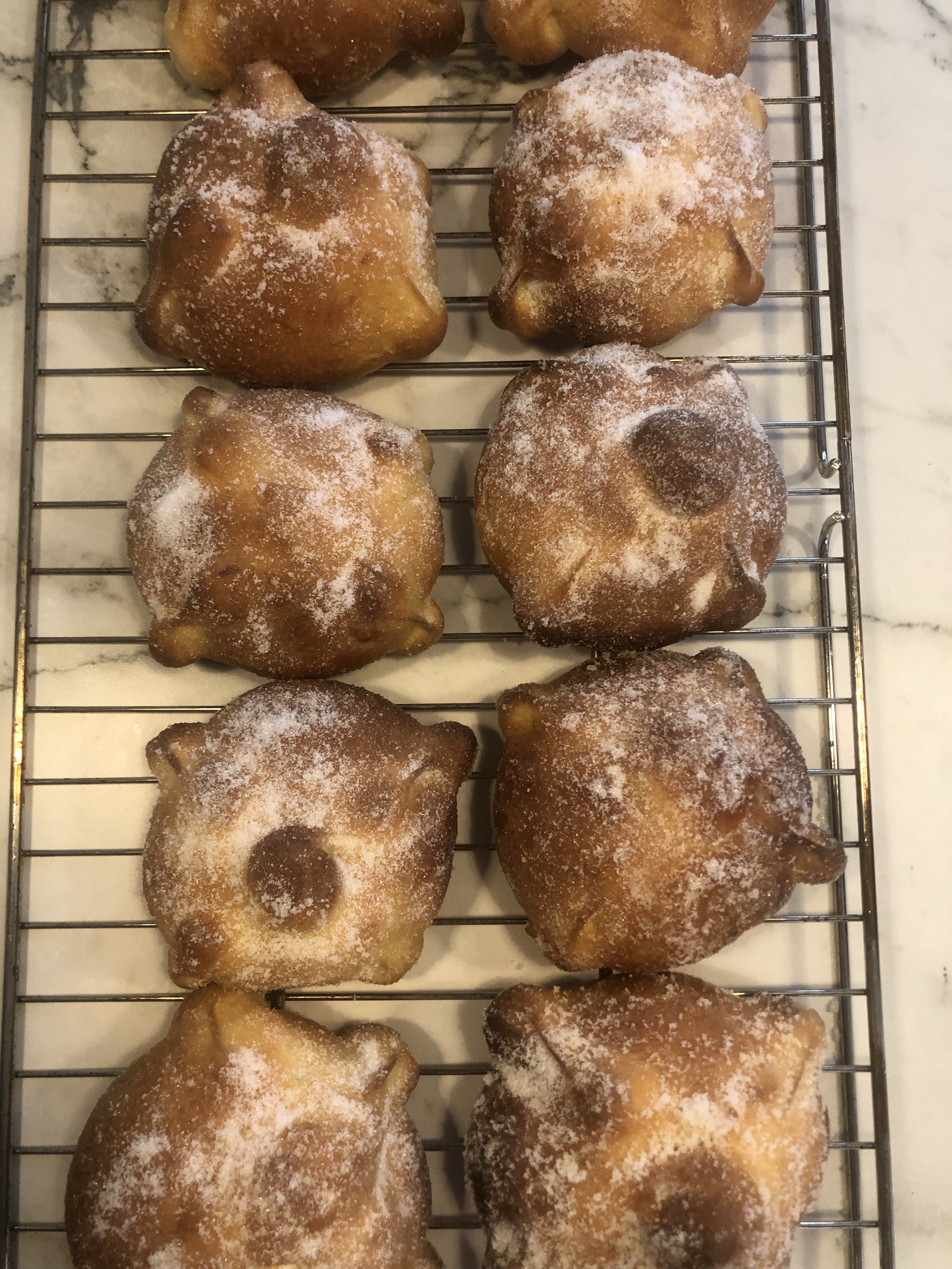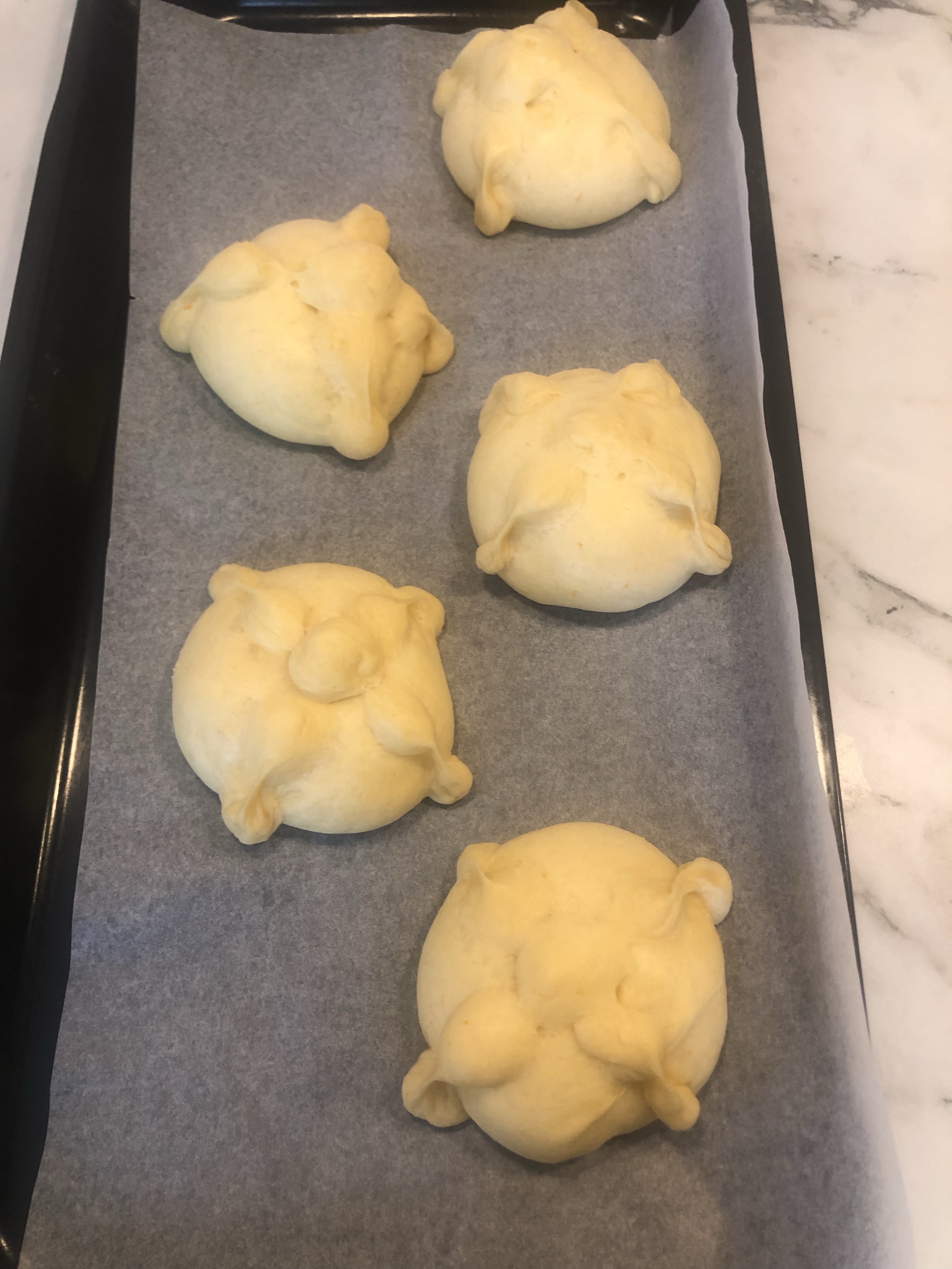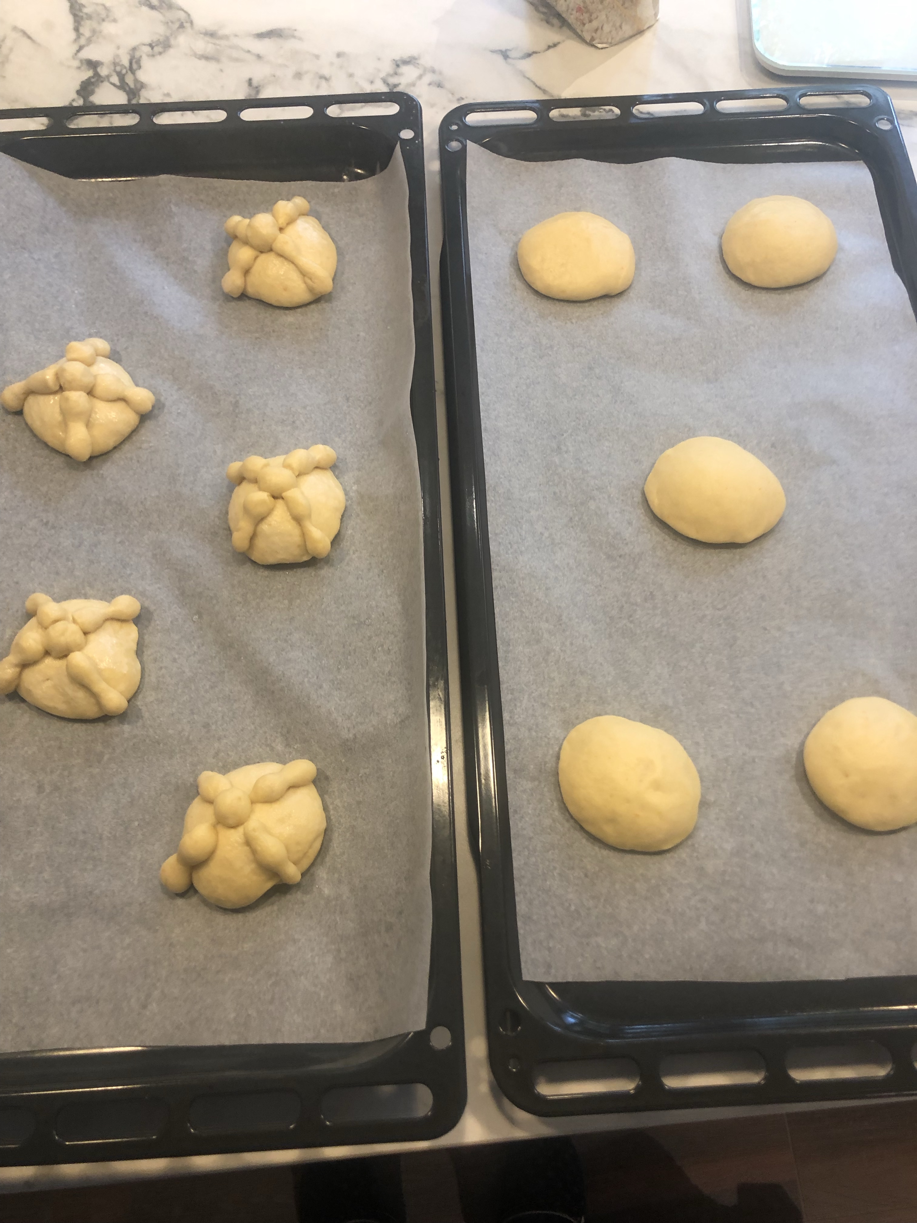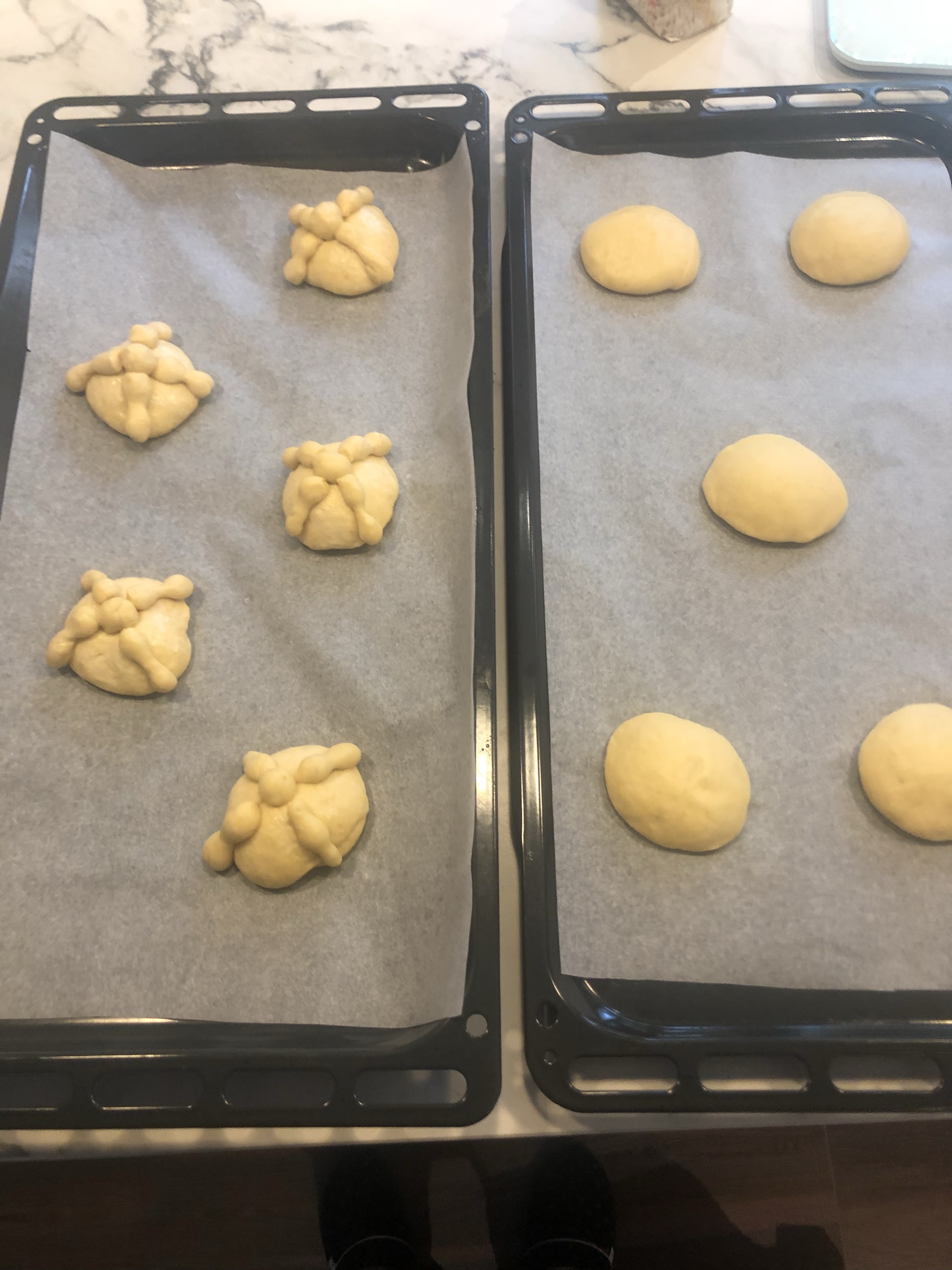 Aplatir les pains pour arriver à un diamètre de 10 cm environ et placez 2 bandes sur chaque pain en forme de croix avec vos mains légèrement humidifiées pour faciliter l’adhérence. Former un petit trou au milieu du pain pour insérer la boule au milieu.