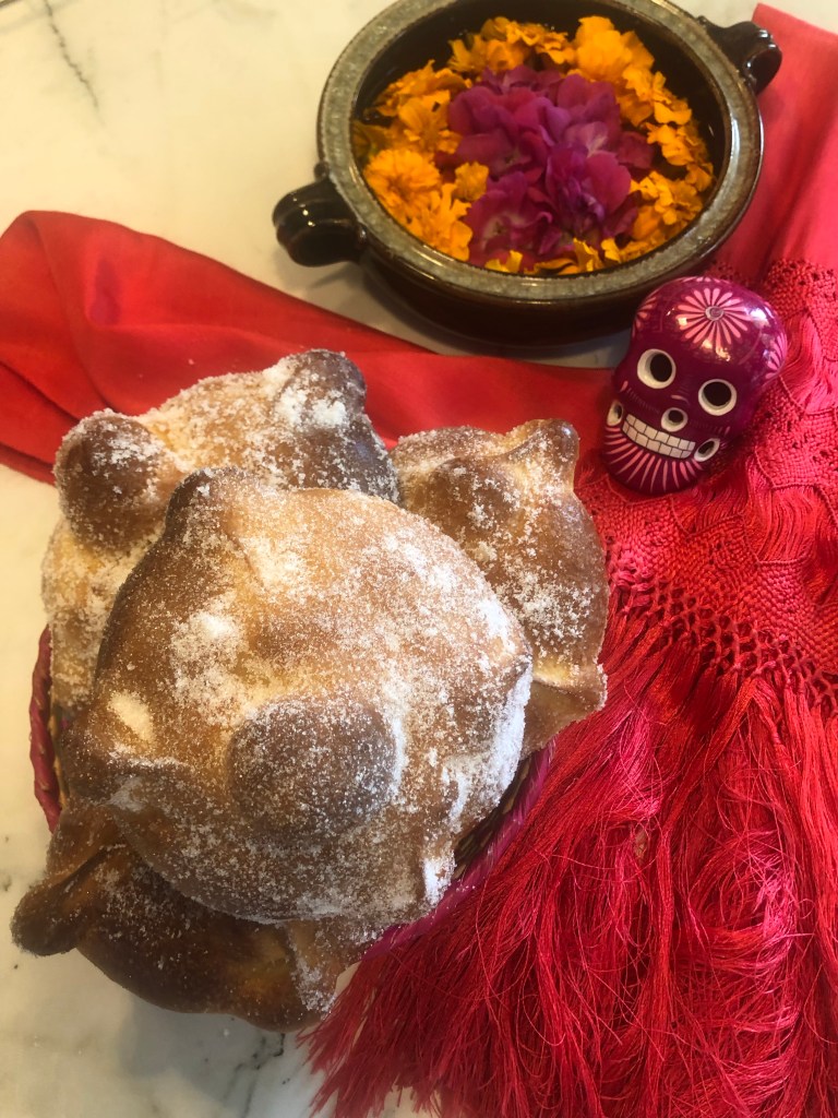Le pain de mort (pan de muerto) est une brioche traditionnelle saupoudrée de sucre, parfumée au zeste d’orange et à la fleur d’oranger préparée pour la période du Jour des morts – Día de muertos célébré le 1 & 2 novembre. Le pain des morts a une forme significative : la forme humaine est la plus basique avec une base circulaire supérieure rappelant le crâne humain. Les traces sur le dessus rappellent les tibias et la saveur de la fleur d’oranger rappelle l’esprit du défunt.