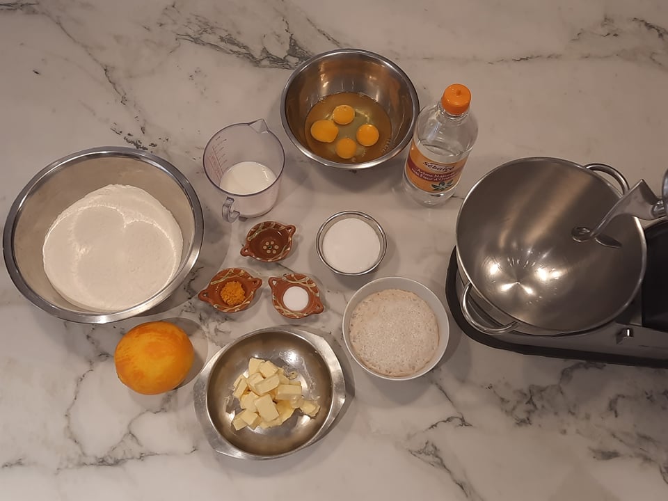 La veille, mélanger la levure fraiche dans un bowl avec le lait tiède, 1 cuillère à soupe de sucre et 1 cuillère à soupe de farine. Laisser reposer jusqu’à que la levure double en taille (environ 30 minutes). Si la levure ne monte pas, ne pas utiliser car cela signifie que la levure est morte. Dans la cuve d’un batteur, mélanger la farine, le sel, le sucre, la lait avec la levure, la moitié des œufs, l’arôme fleur d’oranger et le zeste.