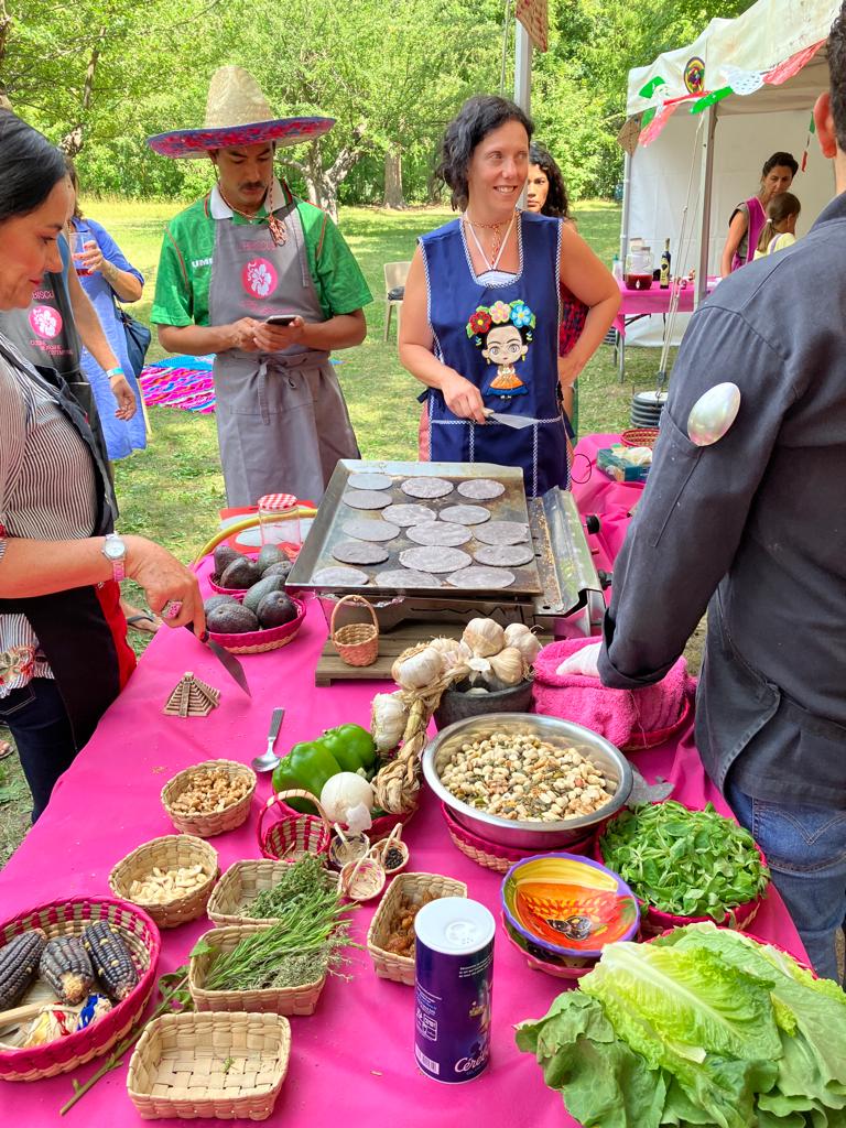 Faire griller avec l’huile ou la graisse (sur une plaque en fonte ou dans un wok) les oignons émincés, les gousse d’ail en chemise, le poivrons, les tomatillos, la courgette les piments. Quand le tout est ramolli et commence à colorer par endroits remettre les épices, les herbes, les légumes et les tortillas secs dans une marmite avec un peu de bouillon et porter à ébullition pendant dix minutes. Laisser tiédir et passer au mixeur jusqu’à obtenir une purée fine sans morceaux.