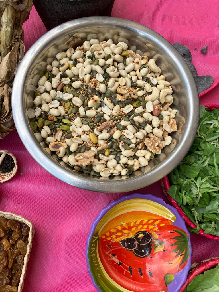 Faire griller à sec les épices, les grains de courge et cacahuètes jusqu’à ce que les grains de cumins soient brunis, laisser de côté.