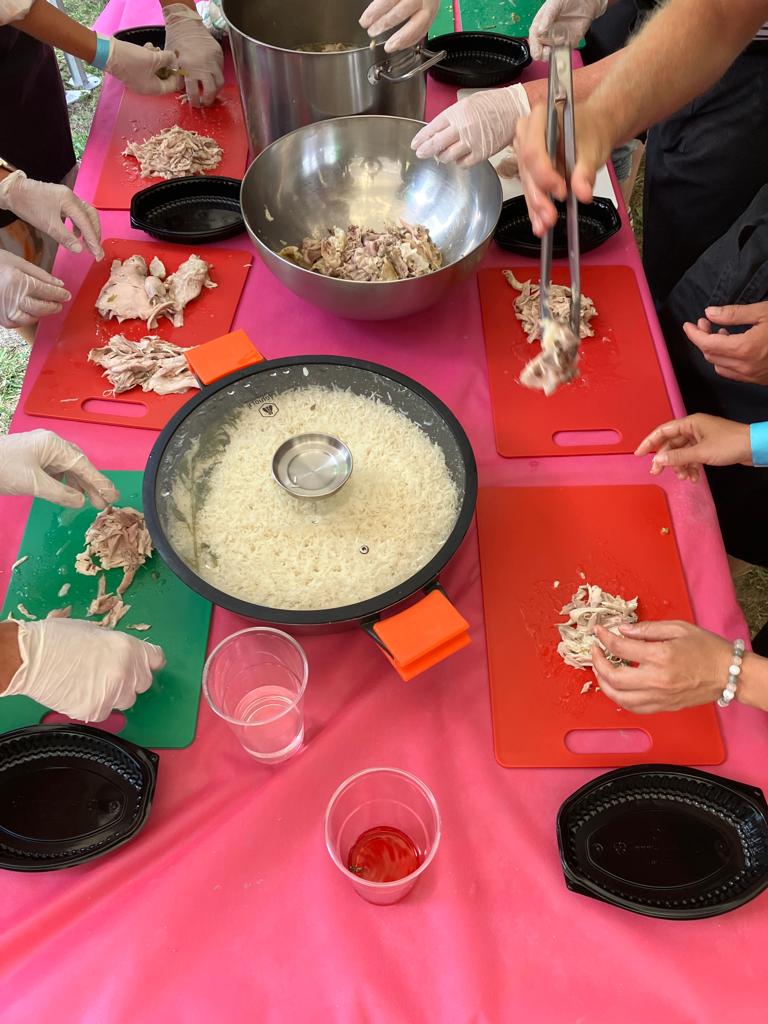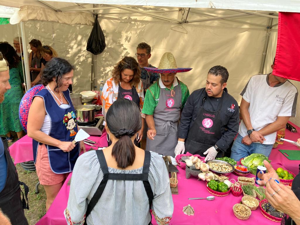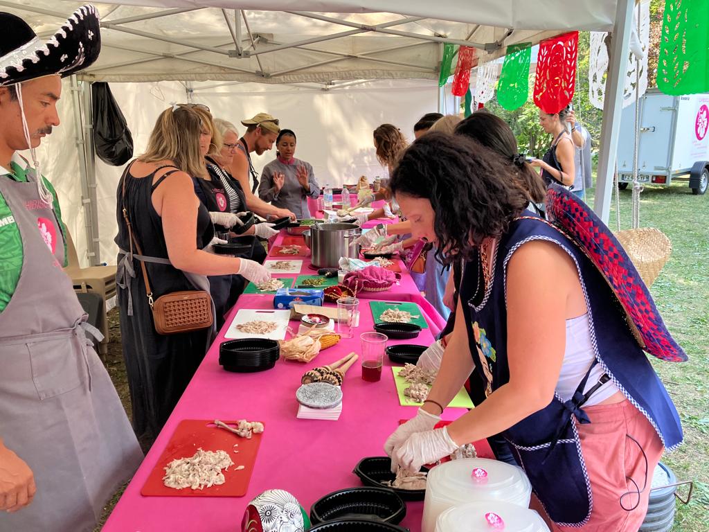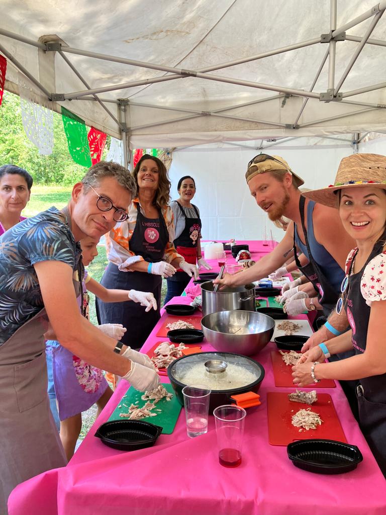 Remettre dans la marmite et rajouter du bouillon si la pâte est trop épaisse ou laisser réduire si trop liquide. Pour le dressage, servir avec du riz blanc, un pilon, une bonne louche de mole verde, grains de sésame, quelques feuilles et fleurs de coriandre et de tortillas de maïs.