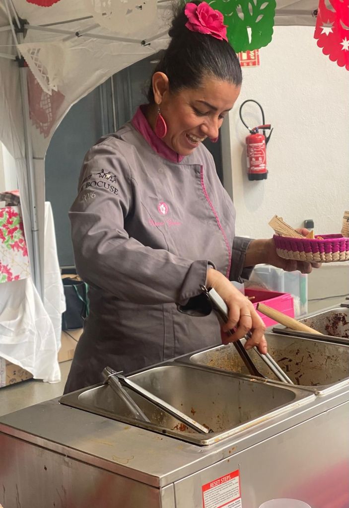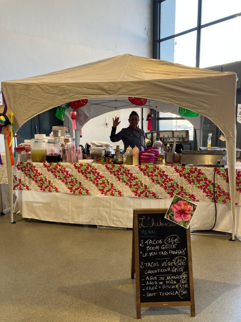 Un stand qui reconstruit le marché mexicain, des tacos avec de la vrai tortilla de maïs utilisant des produits locaux accompagnés des boissons fait maison rafraîchissantes, confection des tortillas artisanales lors de l’animation culinaire, quelques décorations symboliques et pleins de commensals émerveillés par les saveurs authentiques.