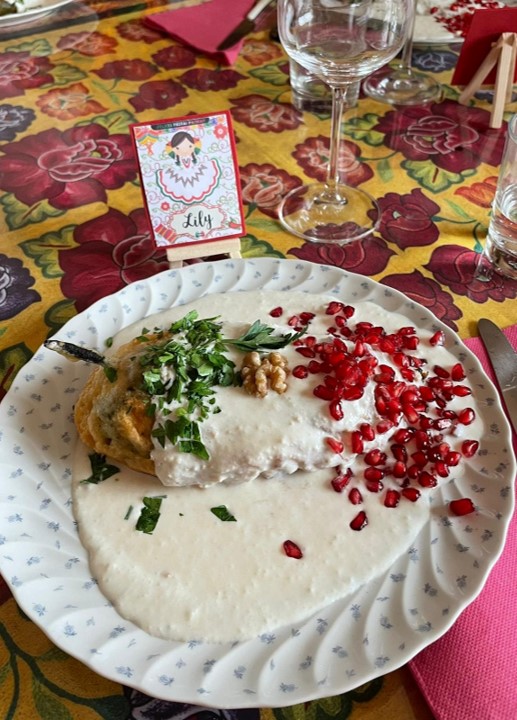 Il s’agit d’un piment vert appelé Poblano grillé, farci de viande hachée et recouvert d’une riche sauce à la crème à base de noix, de persil haché et de graines de grenade.