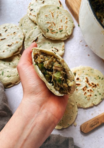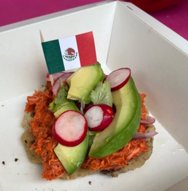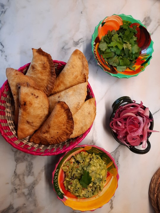 Un en-cas d’origine préhispanique du centre du Mexique, est un chausson de farine de maïs nixtamalisé avec sa garniture de chicharrón et sauce verte version vegan.
